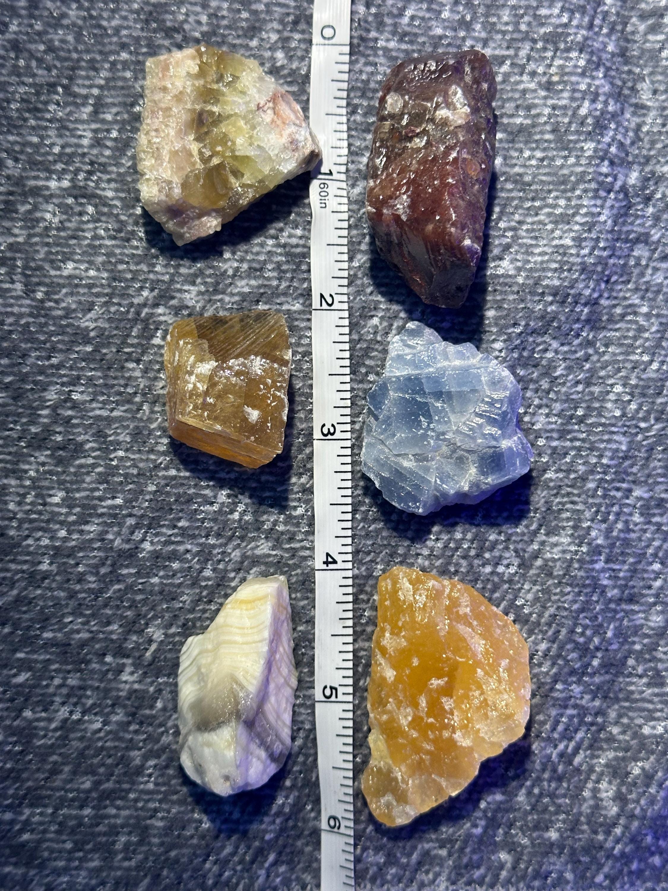 Premium Grade Sets of Natural Rough Calcite, size between about 0.5" to 1". High quality specimens. Set of 6 colors as shown - blue - zebra - green - honey - orange - red. Nice way to sample different calcite crystals at a low, low cost.