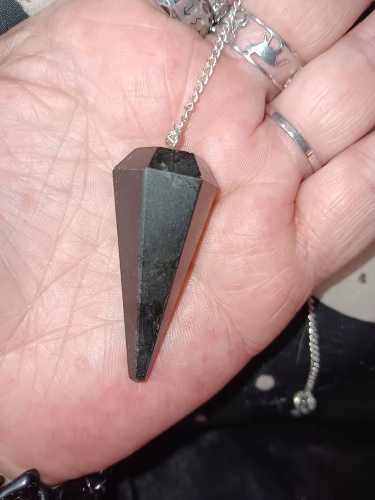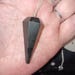 Measuring about 1.5" in length, plus chain, this polished gemstone pendulum is crafted from Black Tourmaline.