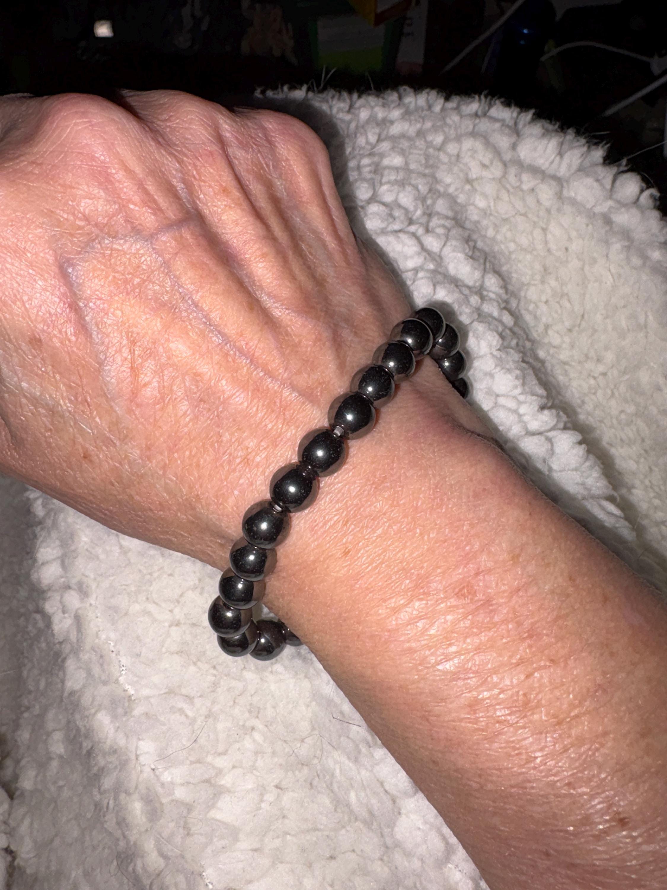 A beautiful bracelet crafted from Hematite beads. Choose between 6 or 8 mm thick beads on a stretchable bracelet, fits most wrists. About 7.5" in size. Great for meditation, crystal healing, Reiki or simply wearing!