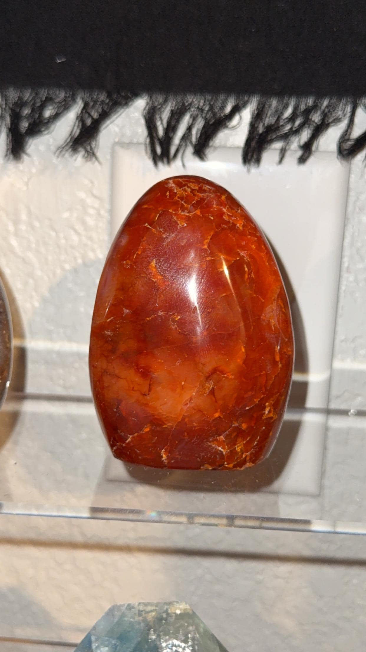 Beautiful Carnelian Freeform Specimens from Madagascar. These pieces have a cut base allowing them to stand freely as lovely display crystals with tons of energy! Each specimen will vary in shape and color. Some have wonderful deep reds and burnt oranges, whilst others vivid white steaks and blood red blotches. A true mystery what crystal may call to you! Polished Carnelian is generally not as ‘smooth’ as most polished stones. Expect to see some rough natural areas, small surface holes, inclusions and pockets of druze. All these unique inclusions are what make Carnelian such an incredible and interesting crystal.