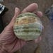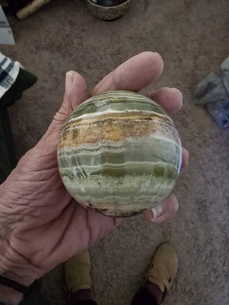 Great green onyx sphere! Coloring and pattern is stunning and it is nicely polished and sits great is the stand provided!